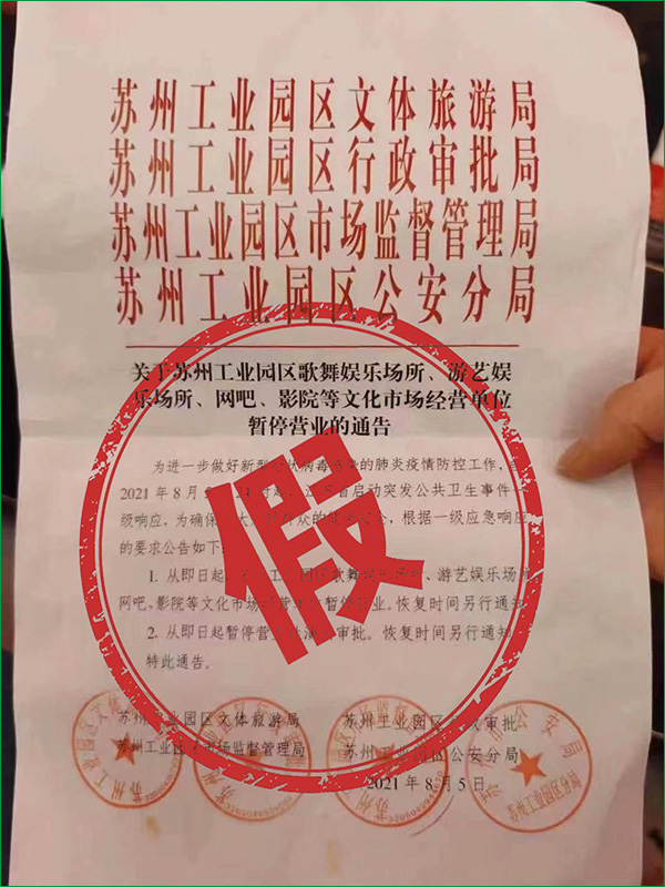 经核实,苏州工业园区文体旅游局、公安分局等相关部门近期未发布此通告,并就制作、传播虚假通告一事开展调查。请园区各文化市场经营单位在做好疫情防控的前提下,依法合规经营。